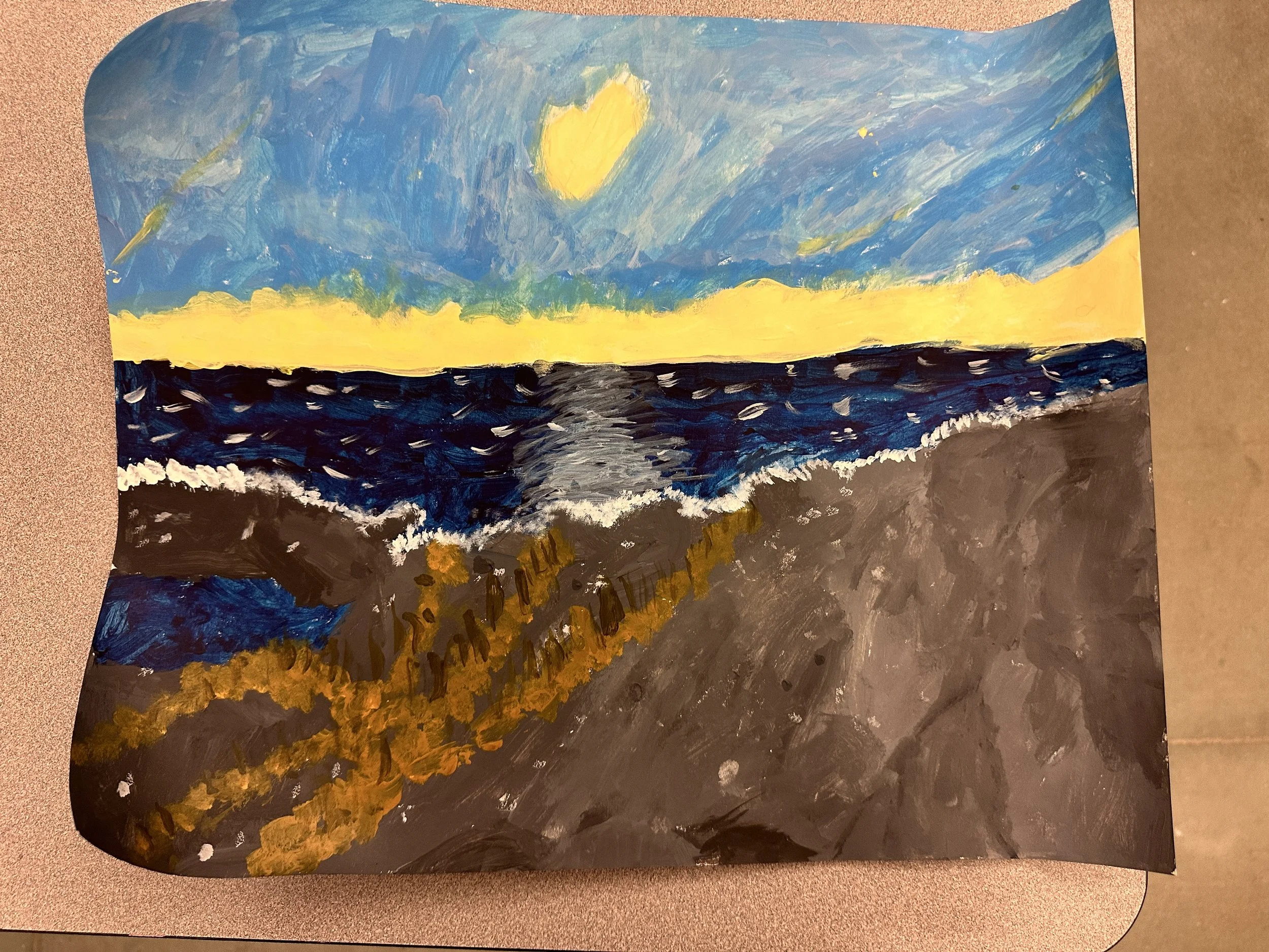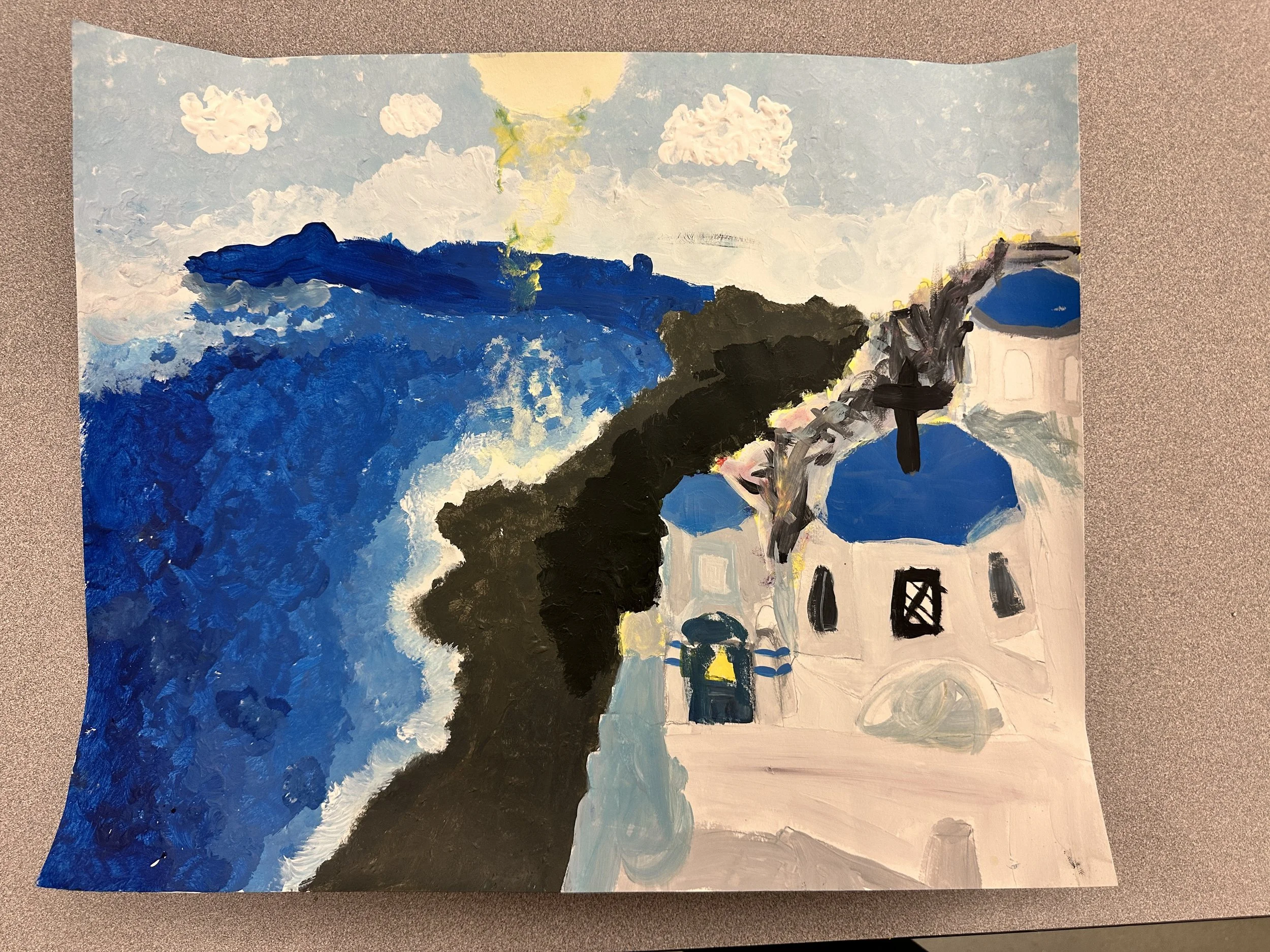 So the first thing I did with the students was a demo on all of these techniques. For the 8th graders, it took two 50-minute classes, and for the 7th graders it took three. They first learned color mixing and analogous colors, then we went over complimentary, shading, and tinting paint. After that I taught them brish techniques they would implement in their paintings, these being glazing, smooth blending, stippling, and the dry brush techniques.